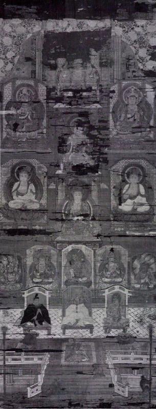 天台宗の東睿山千妙寺に伝わる寺宝の一つです。 日吉山王曼荼羅図(ひえさんのうまんだらず)は、天台宗の総本山比叡山延暦寺の守護神である日吉大社すなわち山王社の諸神や本地仏(ほんじぶつ)が描かれており、大きく分けて三つの系統があります。一つ目は、日吉社の景観を中心に描く「宮曼荼羅図」、二つ目は、各社殿の本地仏を描く「本地仏曼荼羅図」、三つ目は、各社殿の垂迹神(すいじゃくしん)を描く「垂迹神曼荼羅図」です。千妙寺の作品は、上七社(かみななしゃ)の本地仏【※1】七体を中心に描く、本地仏曼荼羅図に分類されます。 【※1】 上七社の本地仏・・・大宮=釈迦如来、二宮=薬師如来、聖真子=阿弥陀如来、八王子=千手観音菩薩、 客人=十一面観音菩薩、十禅師=地蔵菩薩、三宮=普賢菩薩 本作品では、上七社の七本地仏を上部に描き、下部は二段に区切り、上段は中七社のうち五社の本地仏【※2】、下段には京都で天台宗を守護すると考えられた三社(赤山明神、祇園社、北野天神)の垂迹神が描かれています。そして、最上部に帳(とばり)、最下部には勾欄(こうらん)をめぐらした前廊と階を表すことにより、諸仏・諸神が社殿内に安置されるように描かれています。前廊には、獅子と狛犬が左右に安置され、山王社の使いである神猿も描かれています。 【※2】 五社の本地仏・・・右から、早尾=不動明王、下八王子=虚空蔵菩薩、聖女=如意輪観音菩薩、 王子宮=文殊菩薩、大行事=毘沙門天 作られた年代は、鎌倉時代末頃と推定され、東国に伝来する貴重な作品です。
